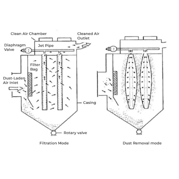 পরিষ্কার করার প্রক্রিয়া: সর্বোত্তম কার্যকারিতা নিশ্চিত করতে পর্যায়ক্রমে ফিল্টার ব্যাগগুলি পরিষ্কার করতে ব্যবহৃত পালস-জেট বা শেকার সিস্টেমের মতো একটি প্রক্রিয়া।